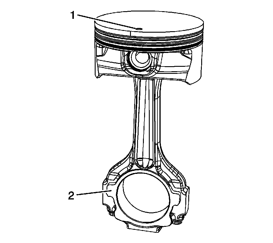 6. Identify the proper installation direction of the piston and connecting rod assembly. When installing the piston and connecting rod assembly, the mark on the top of the piston (1) and the tab (2) on the side of the connecting rod should face the front of the engine.