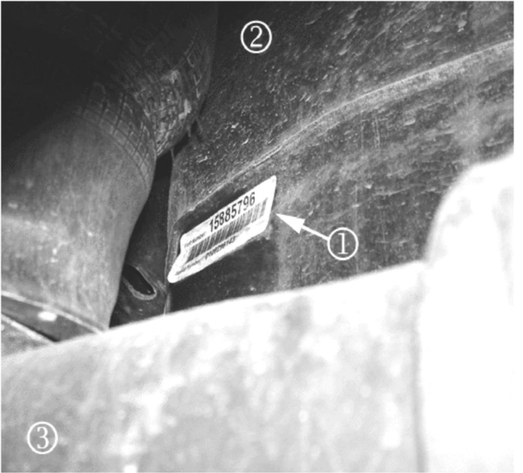 4. Compare the fuel tank serial number printed on the fuel tank label (1) to the fuel tank serial number (sequencing) range shown.
