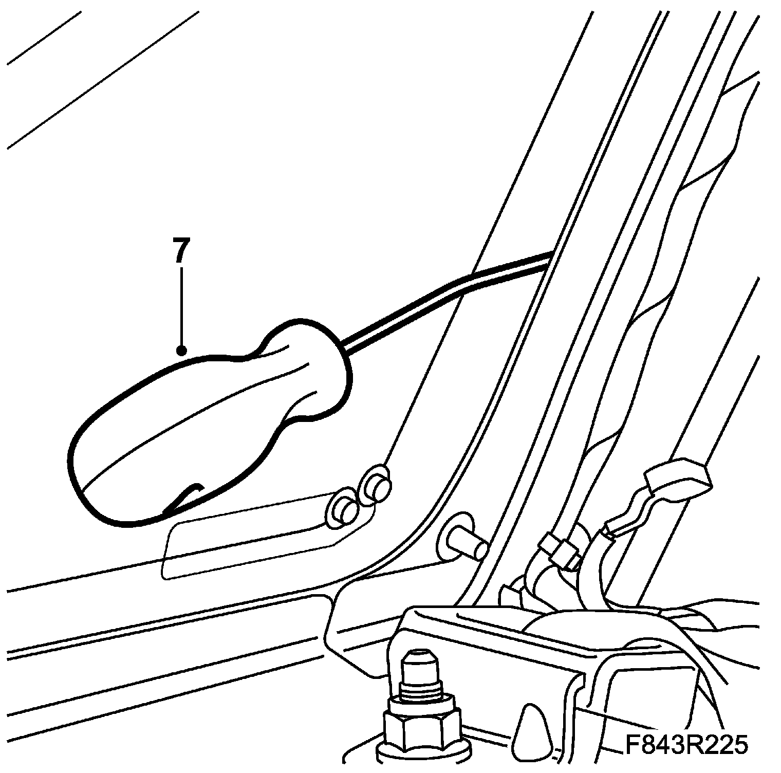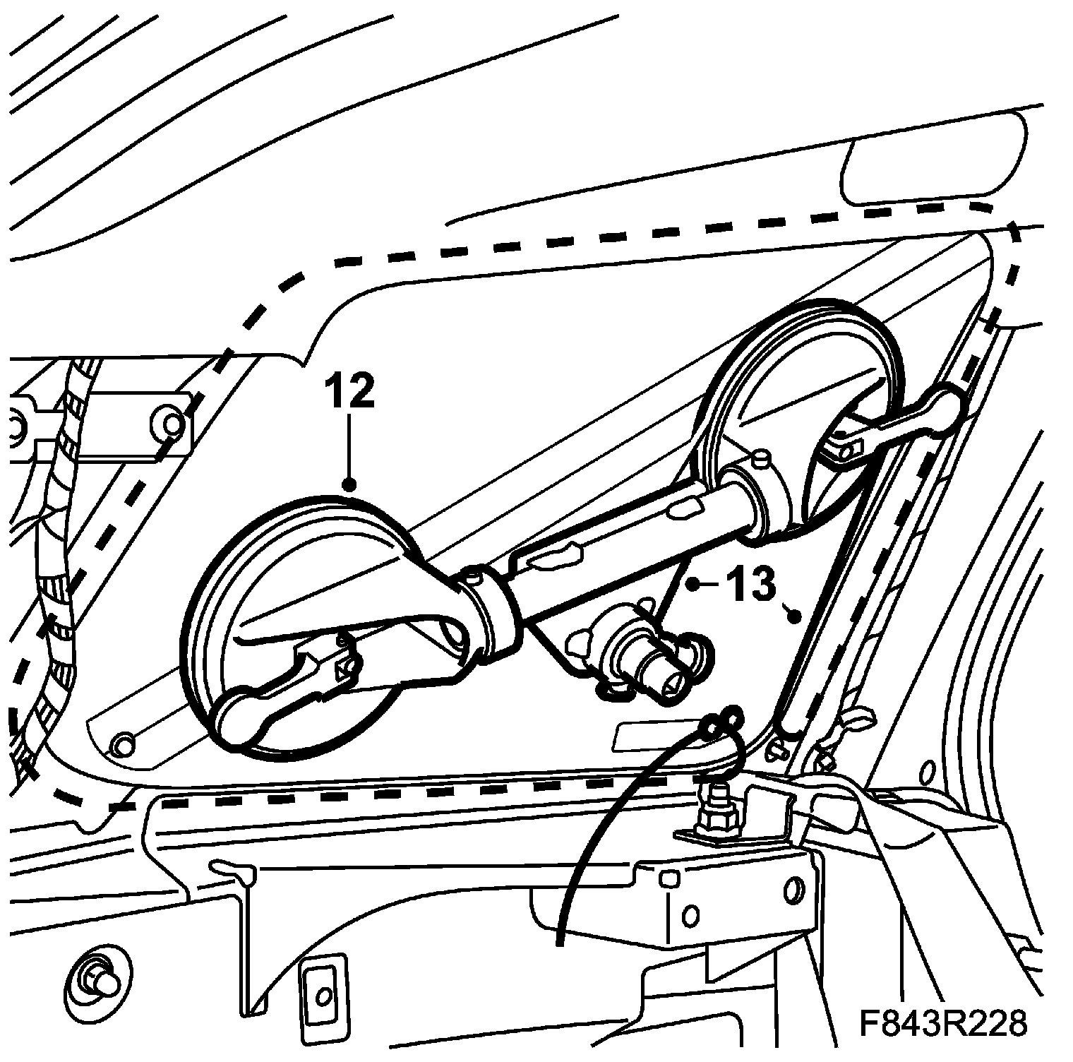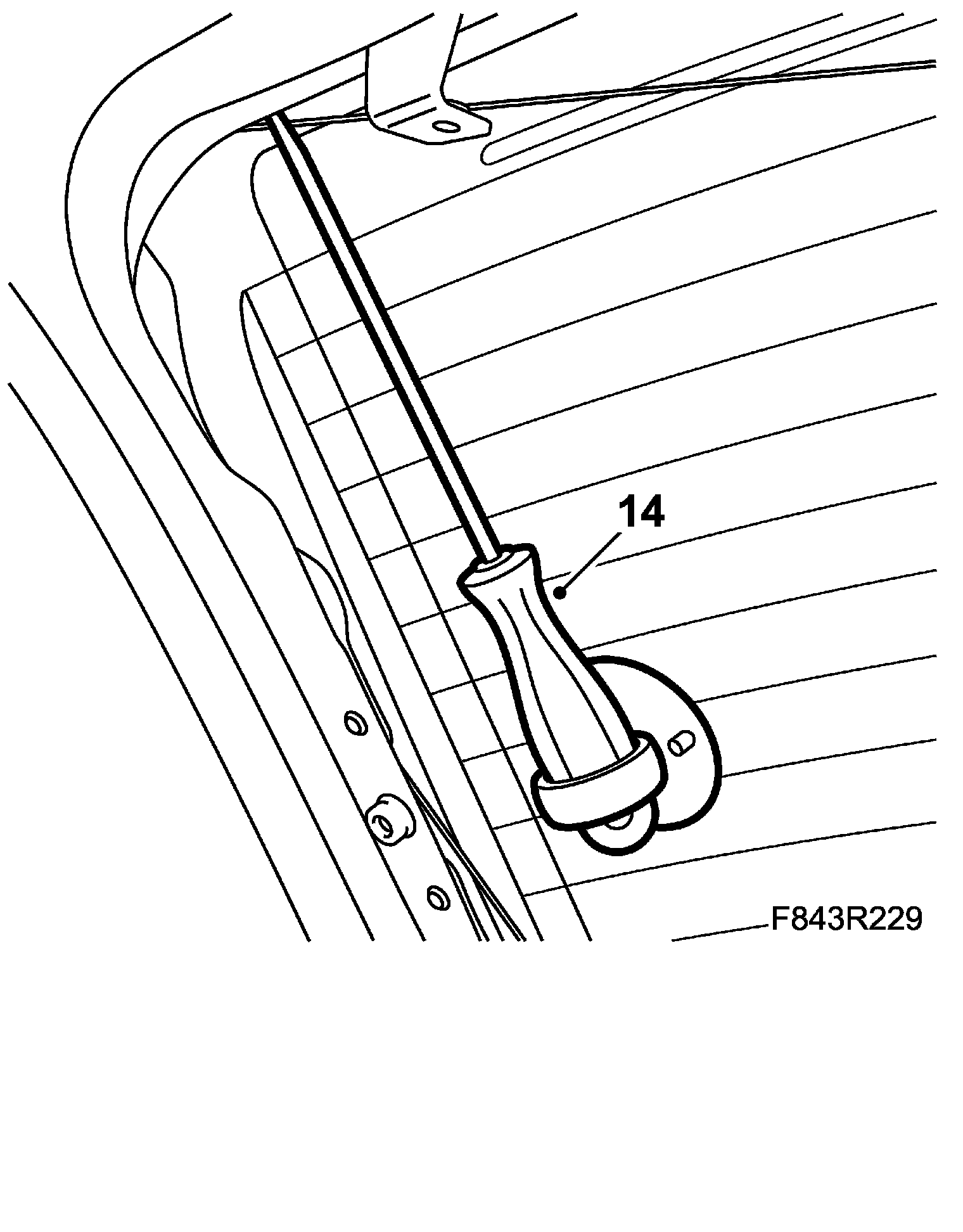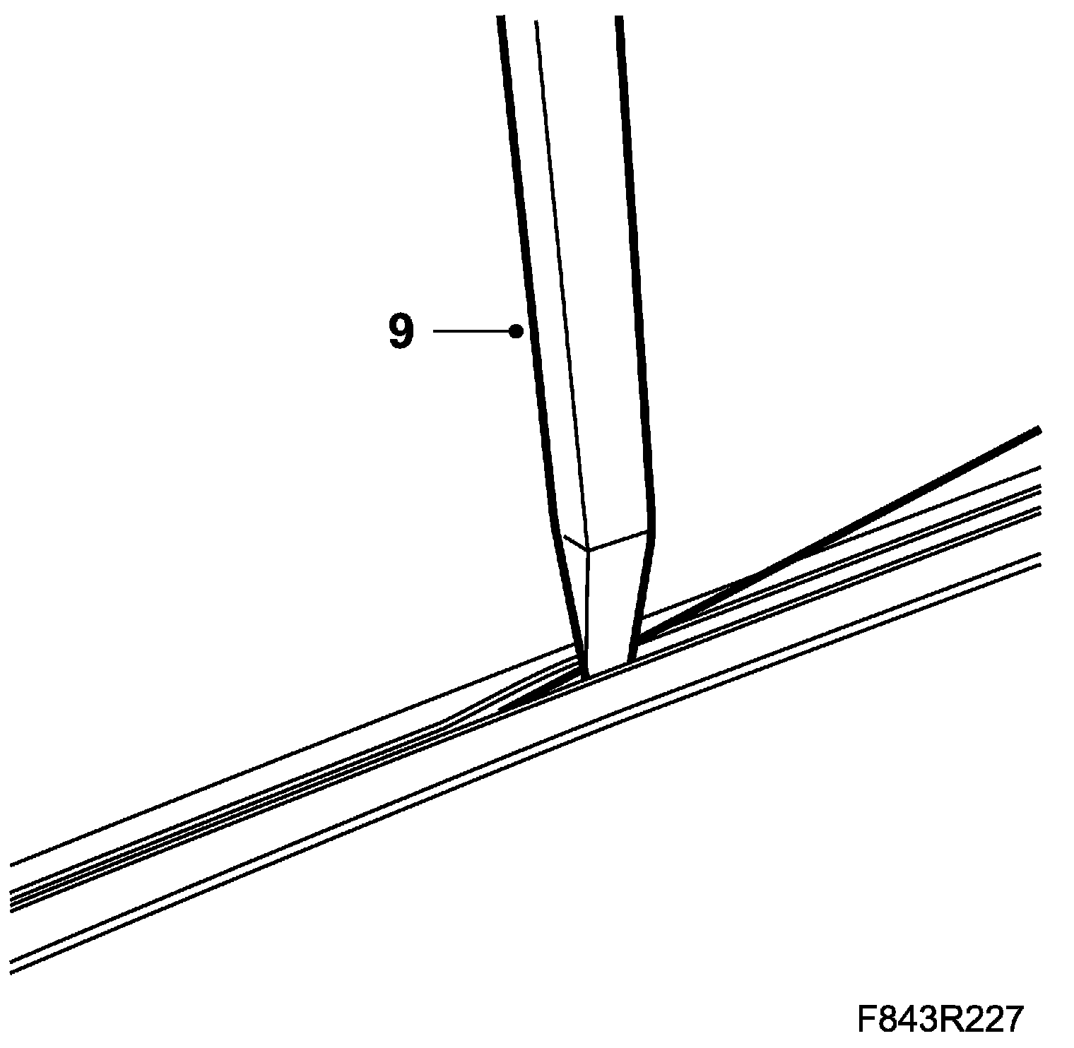 14. Use a ratchet handle to wind the wire coiler so that the wire cuts through the bead of adhesive. If necessary, use the protective tool with suction cup between the cutting wire and metal to prevent the wire cutting against the metal or headlining. Move the wire coiler successively to maintain a suitable angle. An acute angle cuts better. If there is a risk of the wire breaking, stop winding for 10-15 seconds to allow the wire time to work through the adhesive.