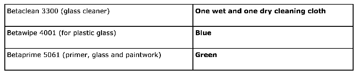 7. Carefully wash the edges of the window with Betaclean 3300. Carefully wipe the edges using the wet cleaning cloth. Dry with the dry cleaning cloth provided in the adhesive kit. Avoid touching the cleaned surface.