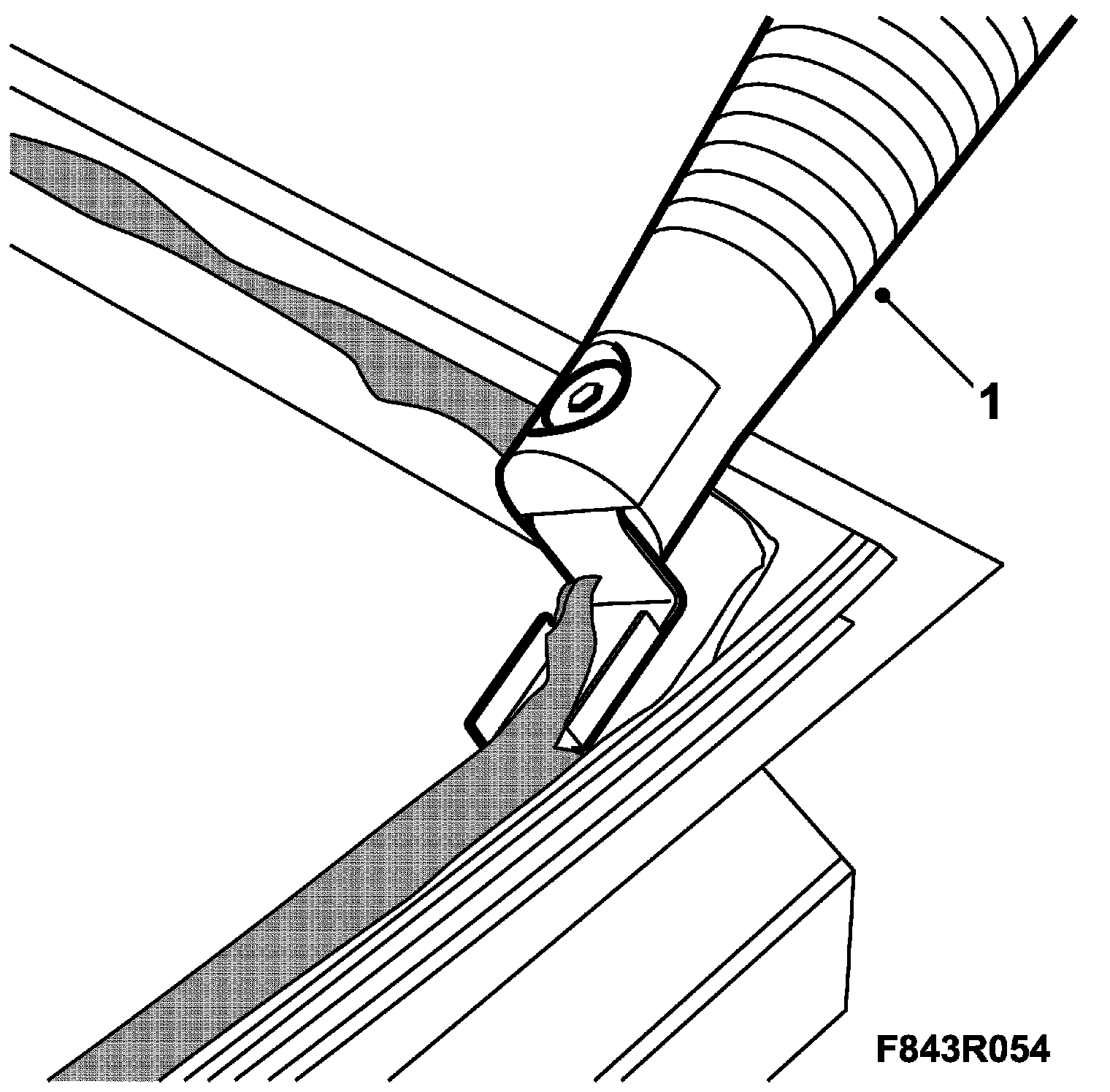 1. Cut down the bead of adhesive on the tailgate to a maximum height of 2 mm. Use the cutting tool provided in the removal kit. If the old window is to be refitted, the bead of adhesive on this must also be cut down to max. 2 mm. Old and firmly adhered adhesive gives a good base for the new adhesive. Loose adhesive on the glass or metal must be removed.