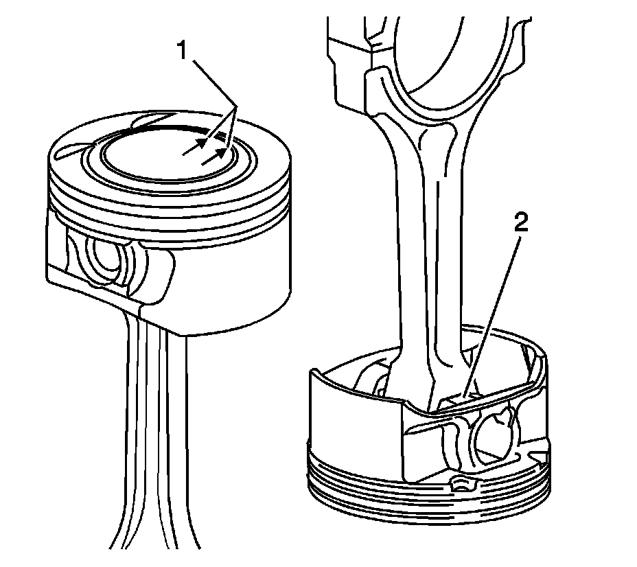 Important: The piston and cylinder bore have been measured and the bore has been sized for the proper clearance. Install the piston and connecting rod assembly into the proper cylinder bore. The piston alignment mark MUST face the front of the engine block (1) or the flat casting boss (2).