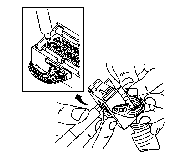 11. Insert the J 38125-560 (GM P/N 15314260) into the 2 triangular cavities on each side of the terminal at the front of the connector. See the release tool cross reference in the Reference Guide of theJ-38125 to ensure that the correct release tool is used.