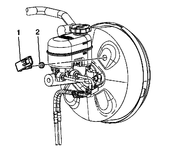 3. Remove the brake booster vacuum sensor grommet (2) from the vacuum brake booster.