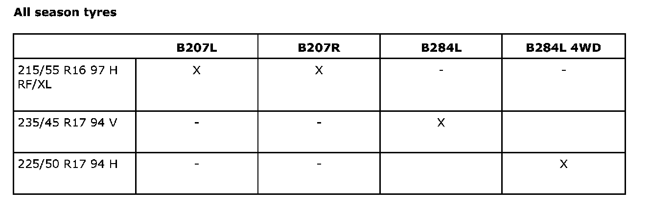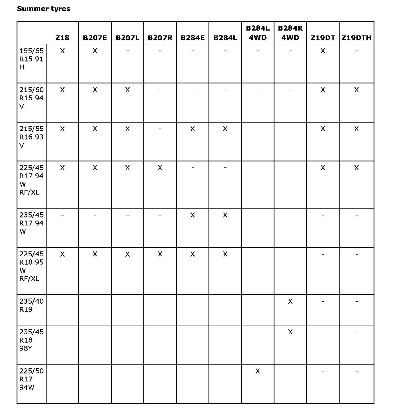 Recommended tire sizesSummer tires