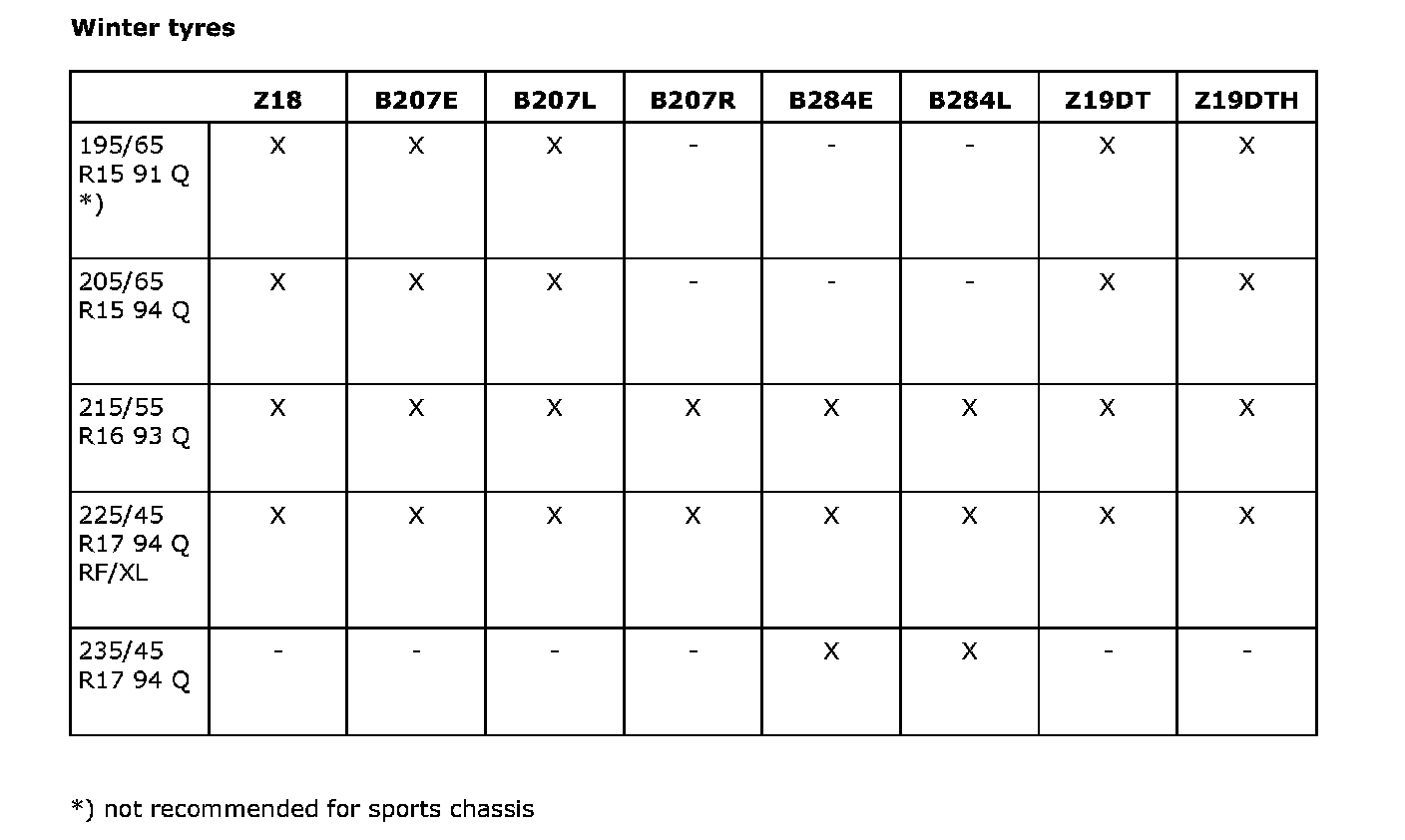 *) not recommended for sports chassis