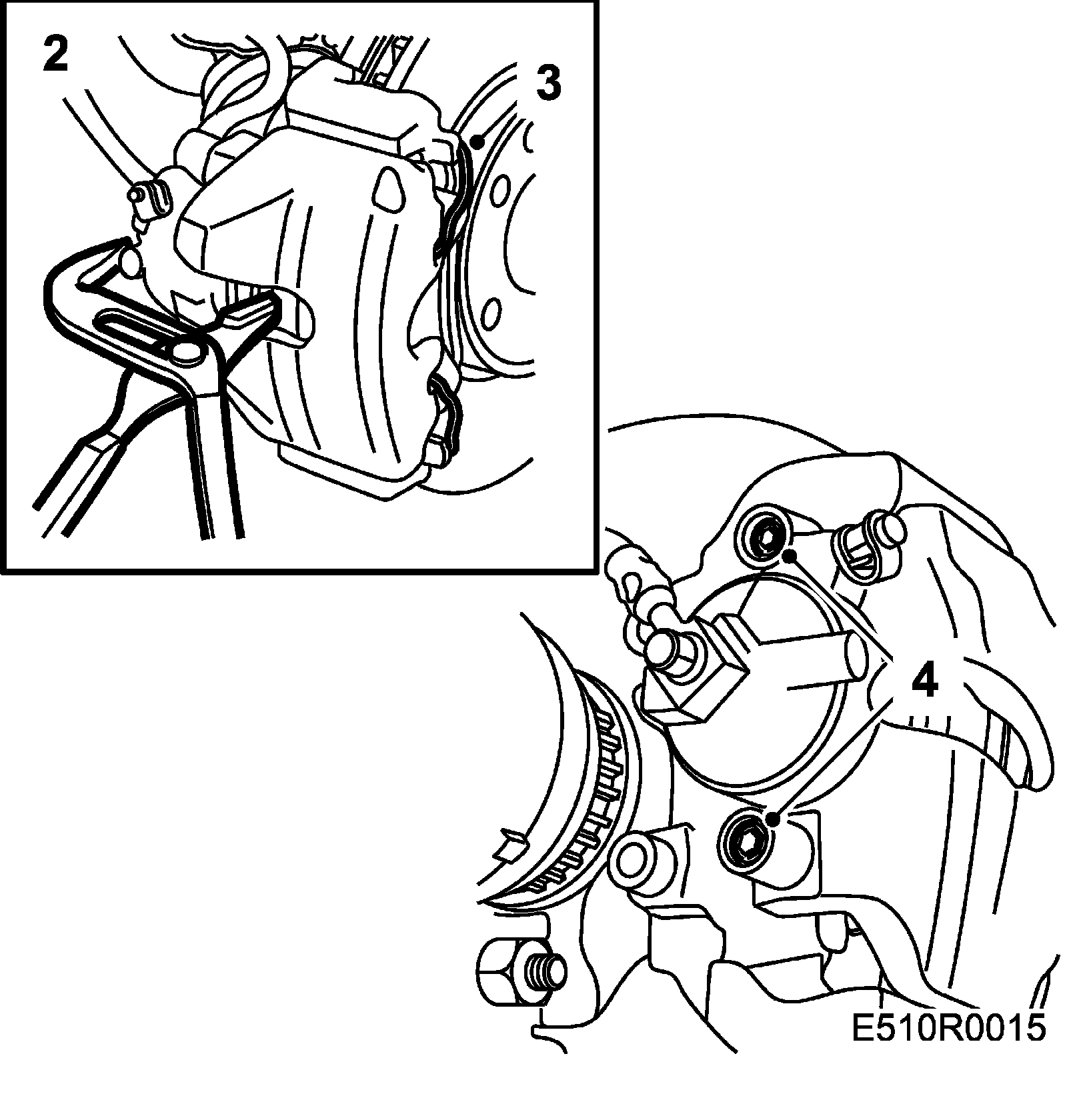 5. Lift the brake caliper off the brake disc and suspend it from the suspension strut.