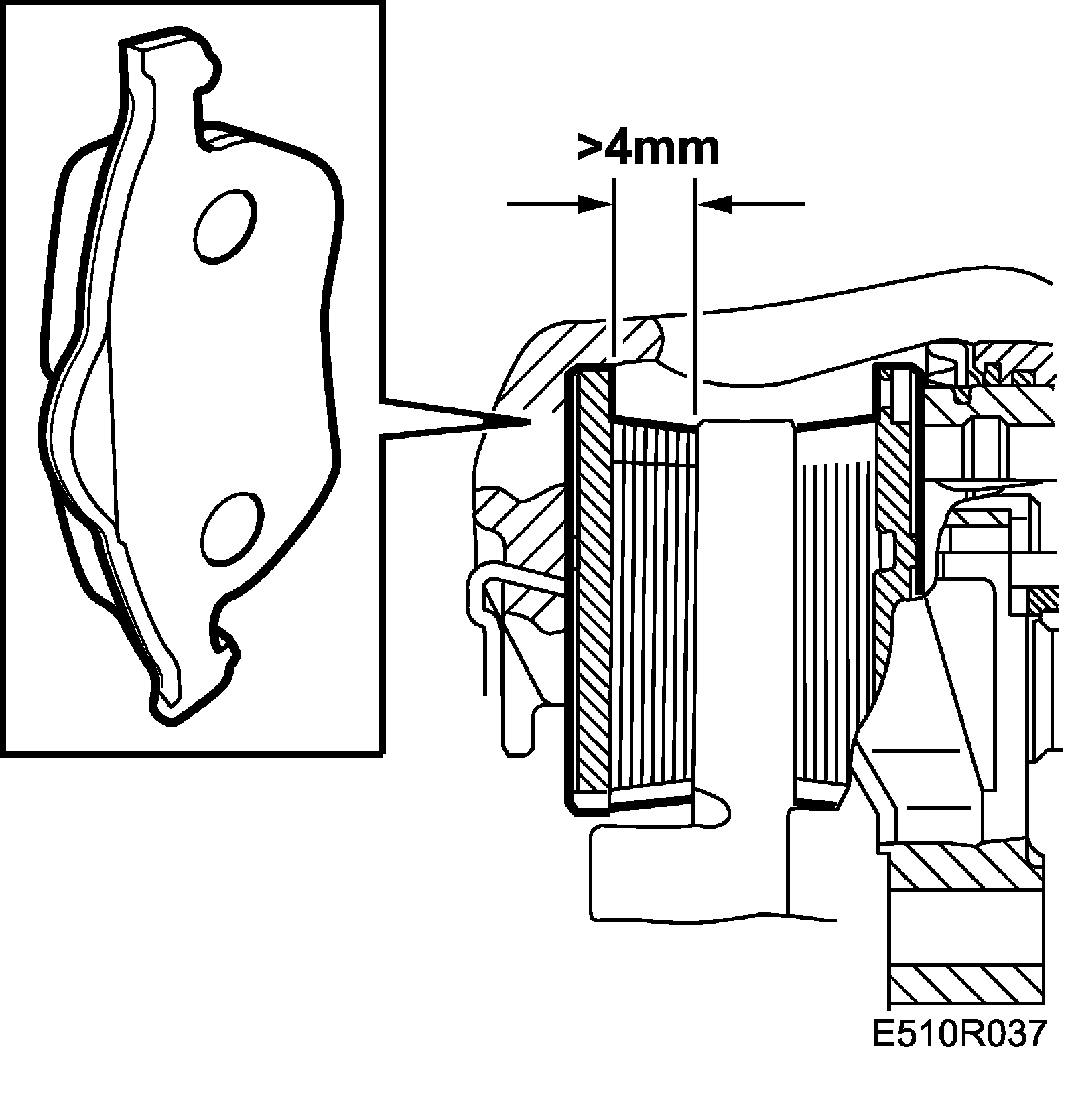 The brake pads should be changed if the thickness of the friction material is less than 4 mm (0.16 in).