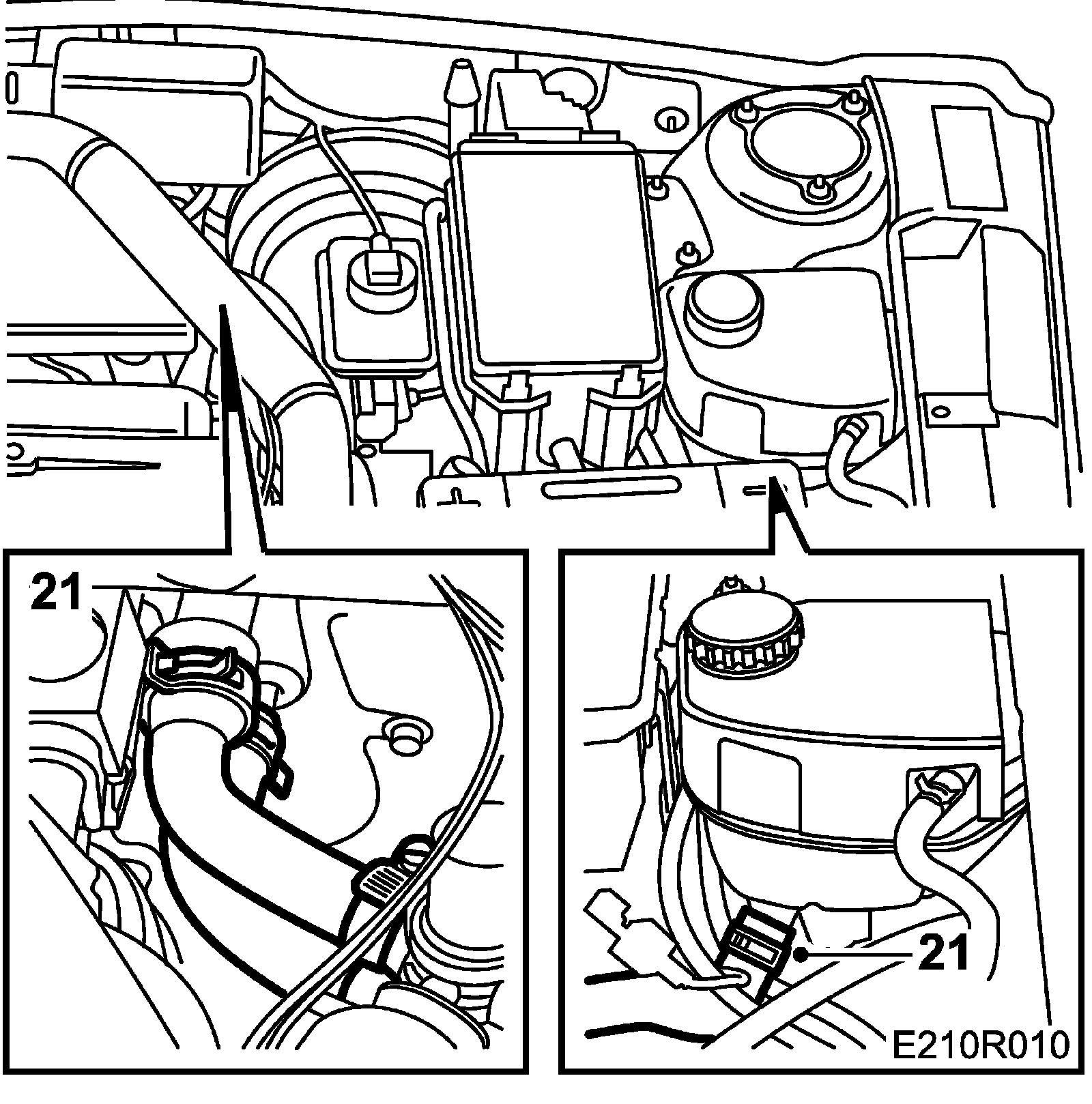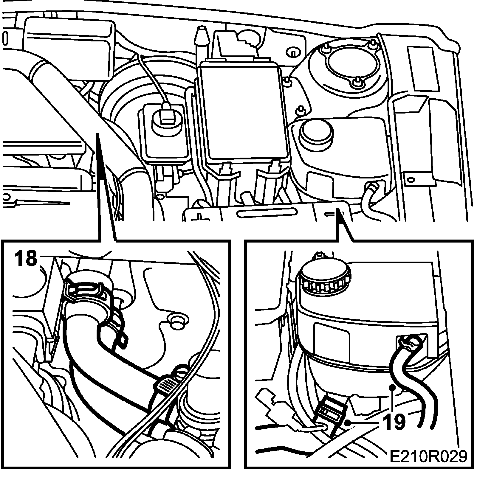 55. Bleed the cooling system as follows: If the car is equipped with A/C or ACC, it must be turned off since these will start the radiator fan. Fill the system to the MAX level, close the pressure cap, start the engine and warm it, preferably at varying engine speeds, until the radiator fan starts. Then fill the system to MAX once more.
