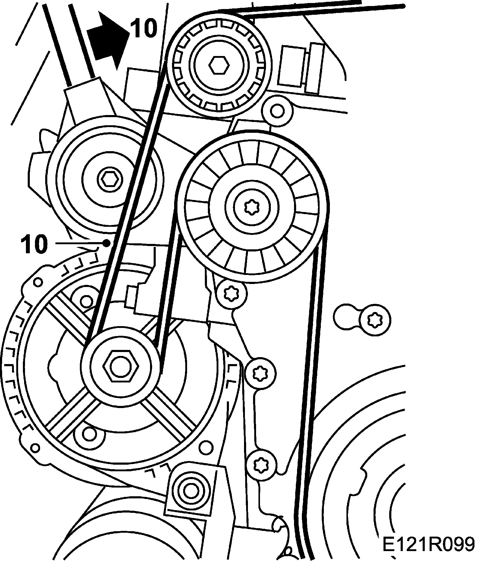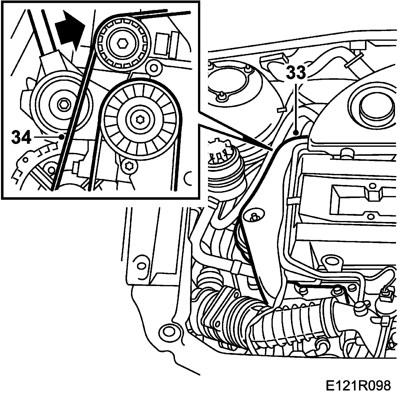 34. Relieve the pressure on the belt tensioner using a ratchet handle and lift off the multigroove belt.