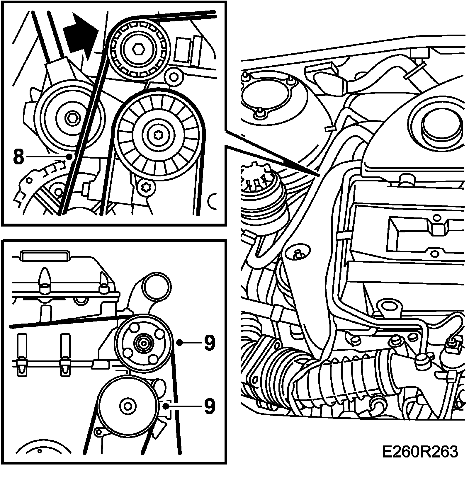 8. Release the tension of the poly-V-belt using 83 95 254 Drawbar handle, hydraulic belt tensioner.