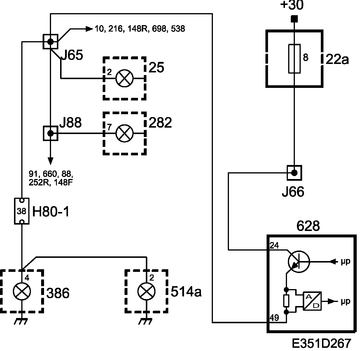 DICE is powered on pin 24 with +30 via fuse 8. DICE powers the button-and-control lighting with a pulse-width-modulated voltage (about 100 Hz) from pin 49 to the buttons and controls (10, 25, 375, 252FL, 252FR, 252R, 148F, 148R, 506, 91, 282, 88, 449, 615LH, 615RH, 386, 514a, 353h).