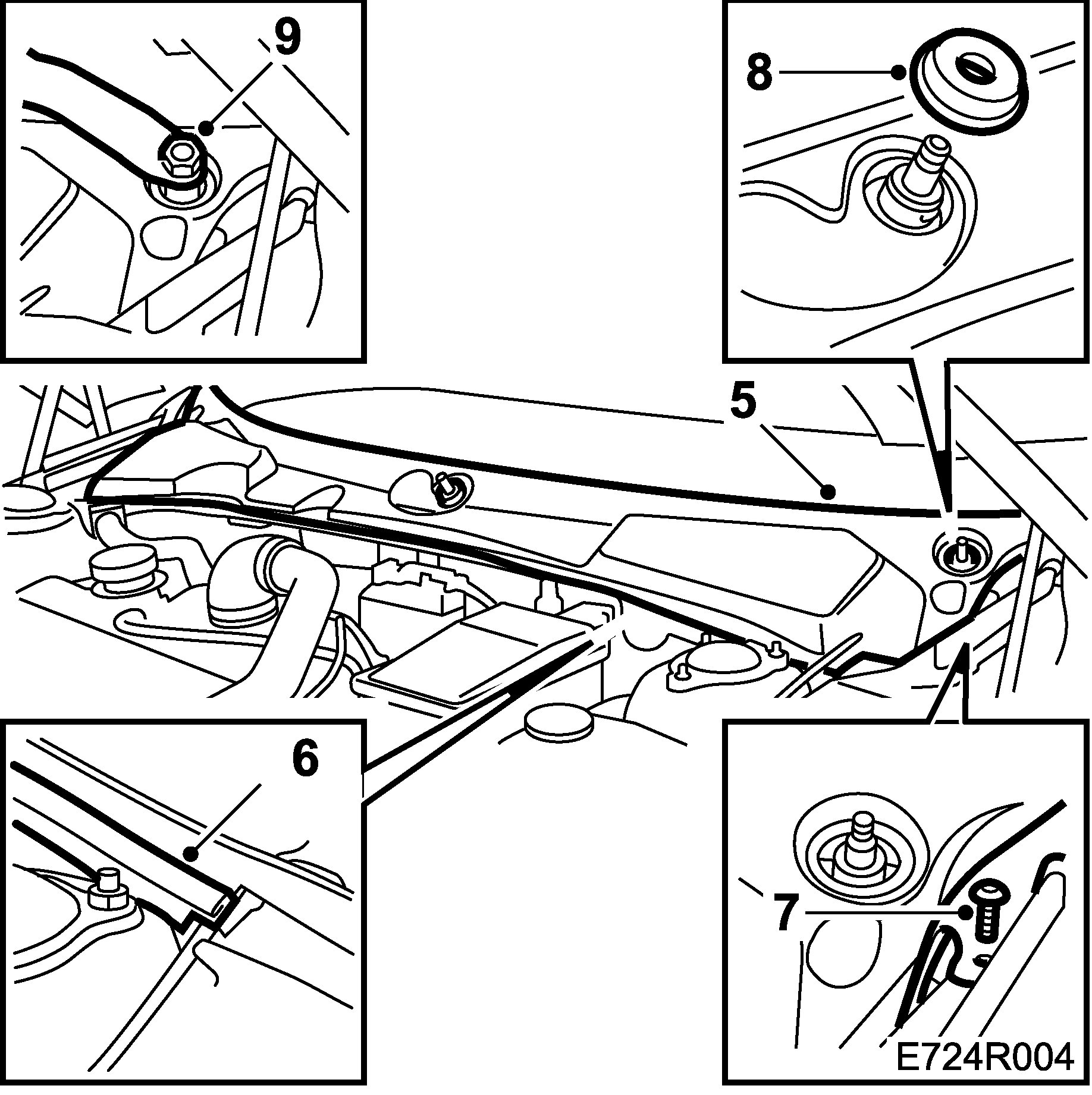 6. Remove the windscreen cover by grasping the front edge and lifting upward/forward. Be careful with the bonnet release wire on the left-hand side.