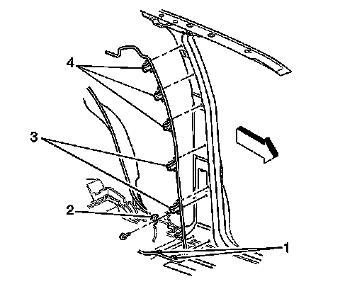 25. Install the center pillar trim panels. Refer to Center Pillar Garnish Molding Replacement (Center Pillar Garnish Molding Replacement).