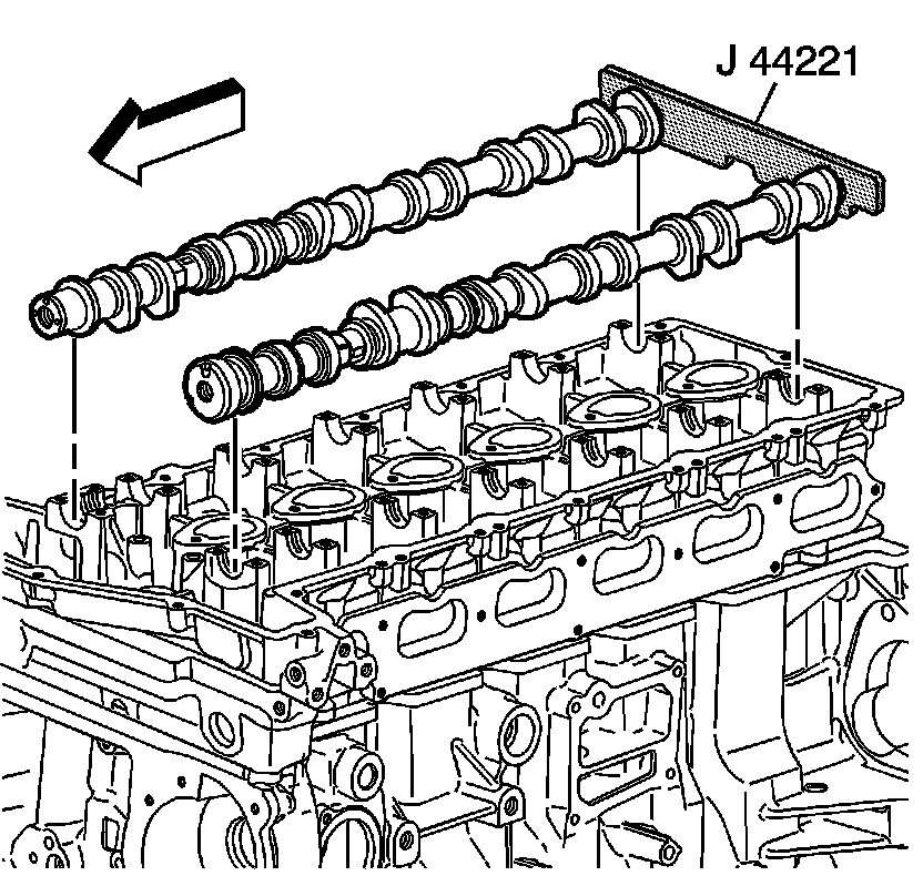 Note: It may be necessary to remove J 44221 to rotate and hold the camshaft (hex) to align the pin to the camshaft sprocket.