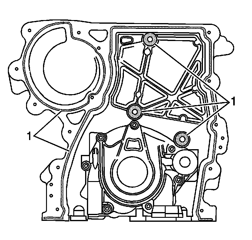2. Apply a 3 mm (0.12 in) bead of sealer to the trace grooves on back side of the engine front cover (1). Refer to Adhesives, Fluids, Lubricants, and Sealers (Adhesives, Fluids, Lubricants, and Sealers) for the correct part number.
