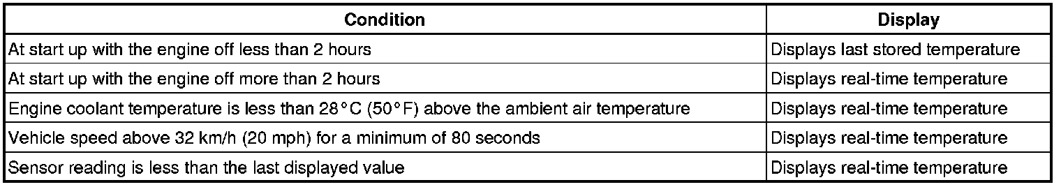 The ambient air temperature sensor mounts underhood and can be affected by city traffic, by idling, and by restarting a hot engine. Therefore, the HVAC control module filters the value of the ambient air temperature sensor for temperature display. The ambient air temperature value is updated under the following conditions: