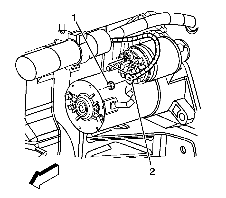 6. Remove the starter mount bolt and nut (1, 2).