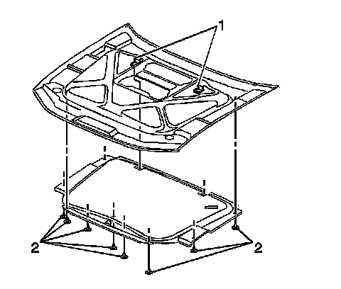 1. Remove the push-pin retainers (2) from the hood insulation and front seal.