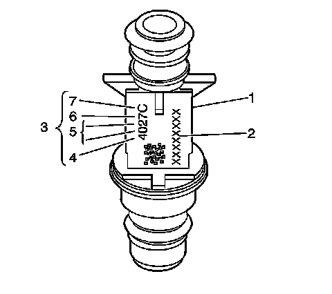 The fuel injector (1) is stamped with a identification part number (2). A 4-digit build date code (3) indicates the month (4), day (5), year (6), and the shift (7) that built the injector.