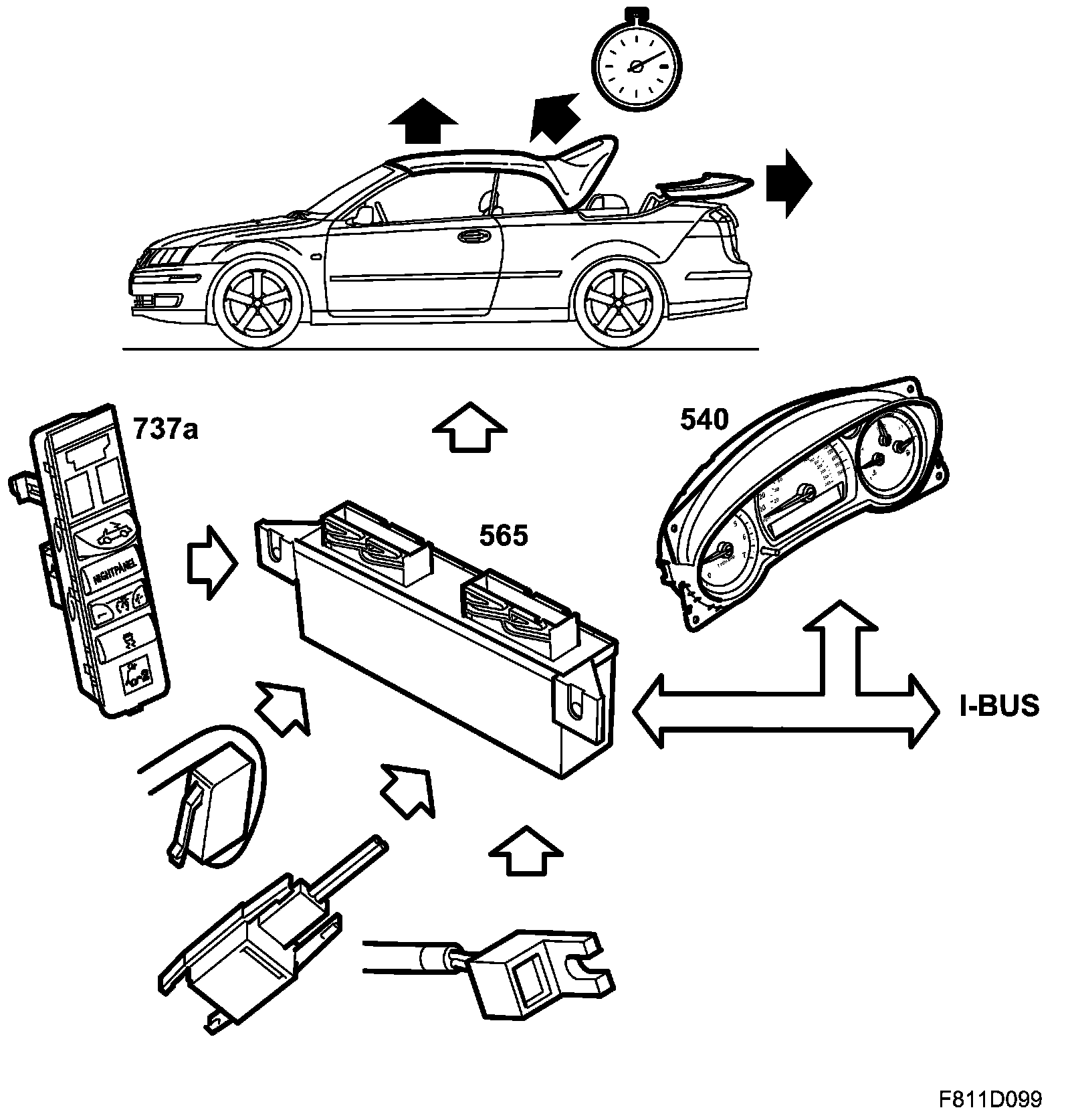 The driver requests the opening or closing of the soft top with the switch or the remote control. The STC control module operates the soft top hydraulically using information from a number of position sensors integrated in the mechanism's cylinders.