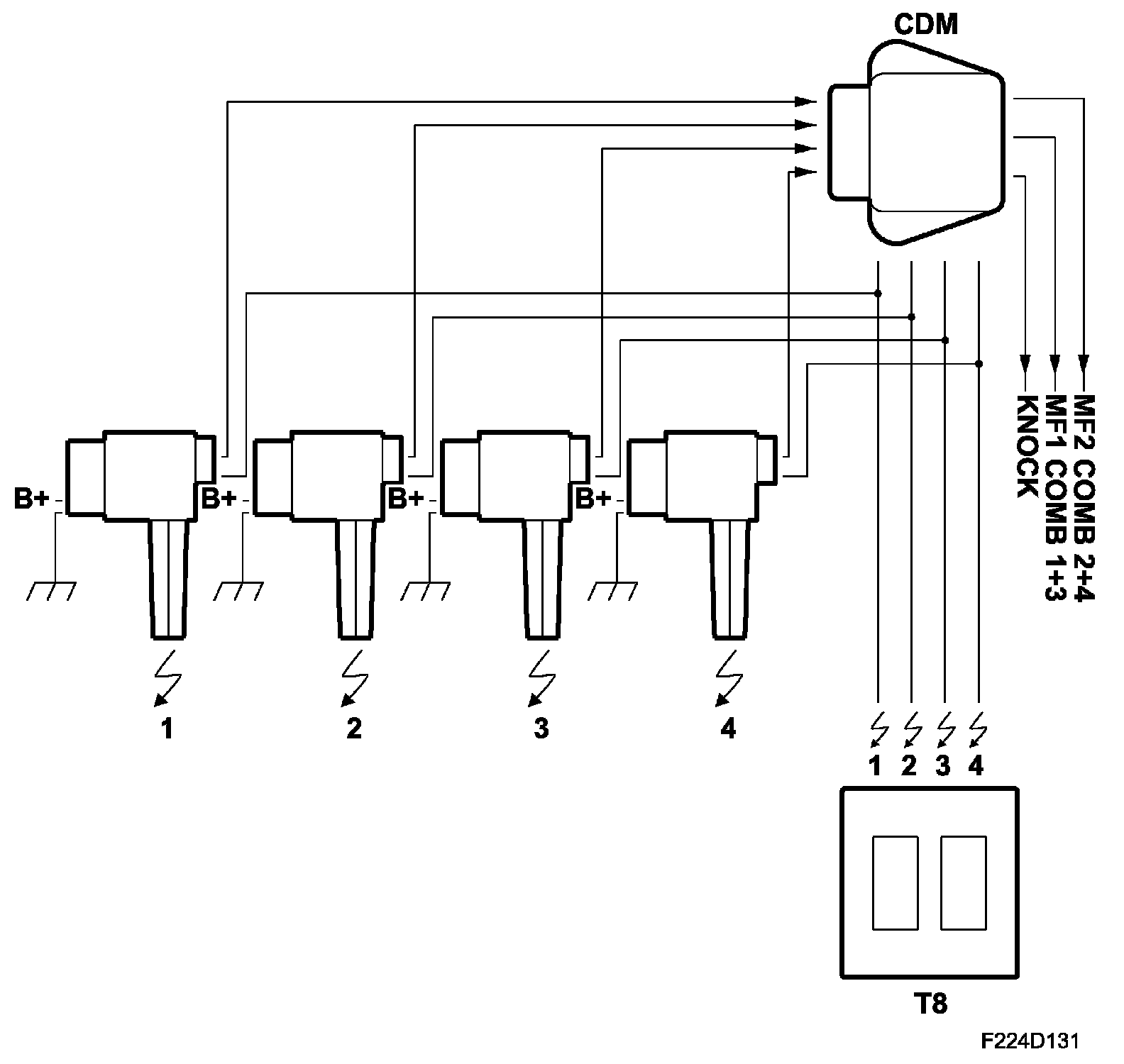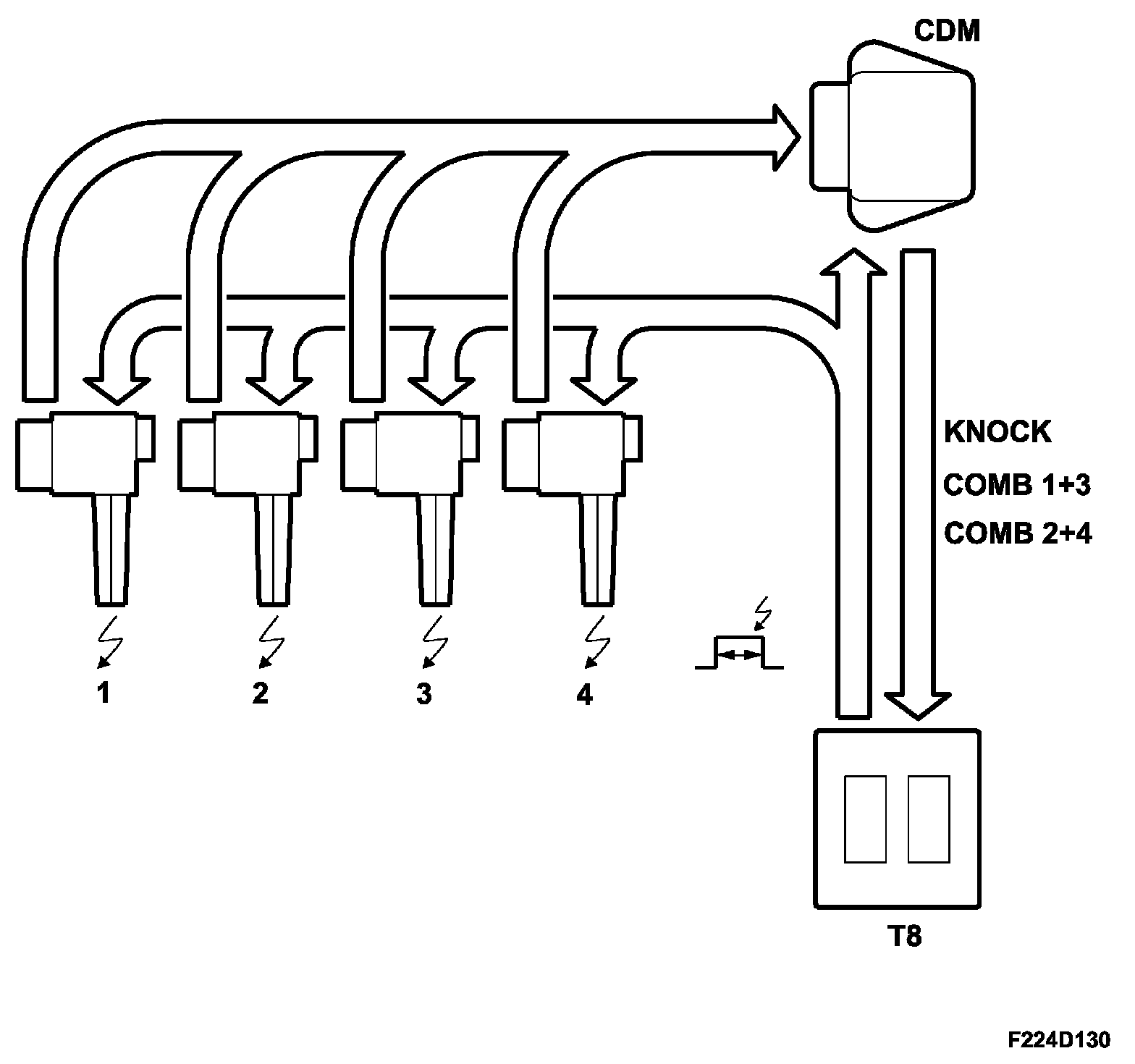 Four ignition trigger lines from ECM are connected to the ignition system as follows: