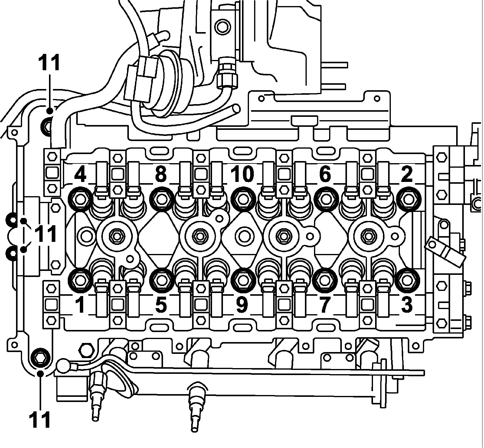 Cylinder head to cylinder block, step 1 30 Nm (22 ft. lbs.) M11