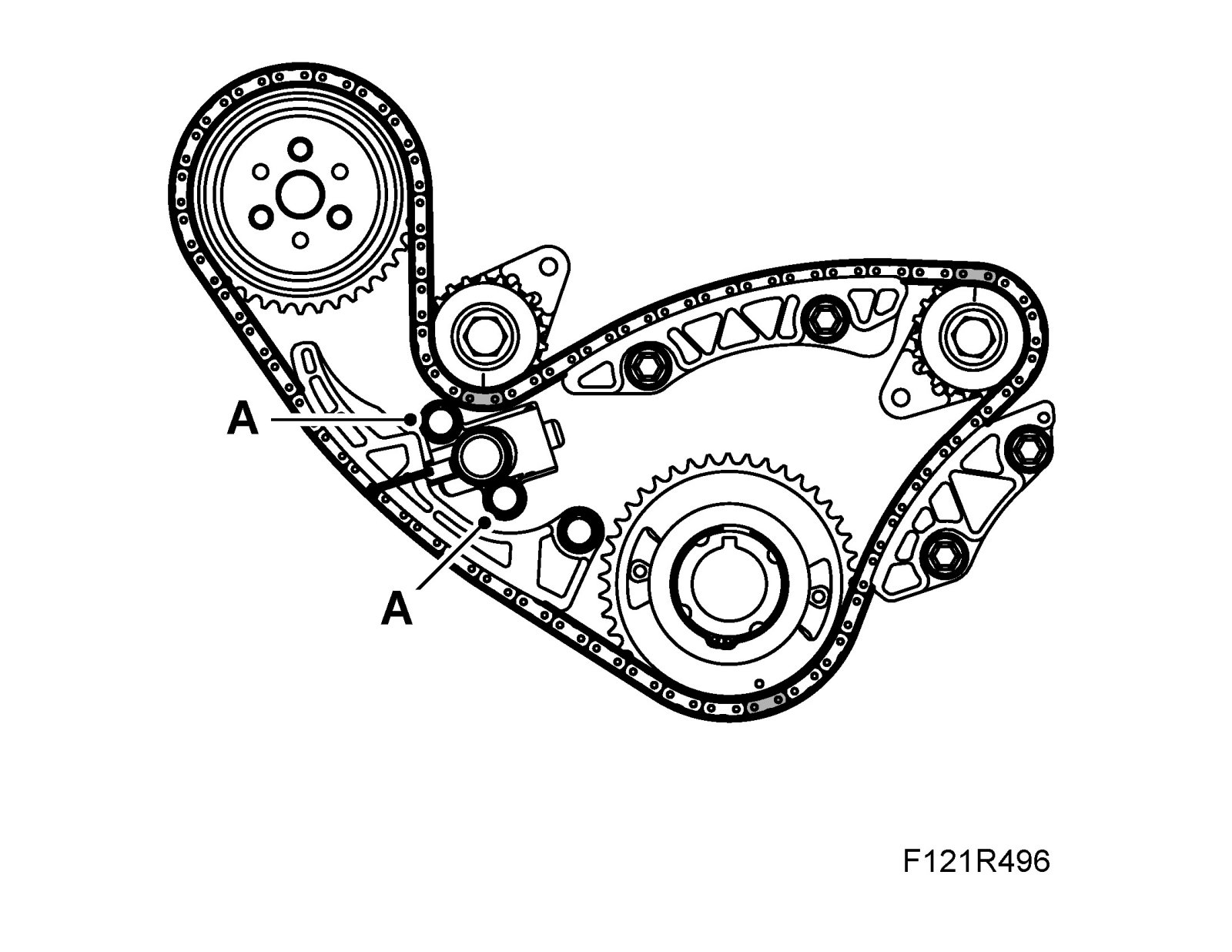 3. Fit the chain tensioner. Load the tensioner by pressing in the plunger and turning to the right. Then secure with tool 83 96 392 Lock pin. (A)