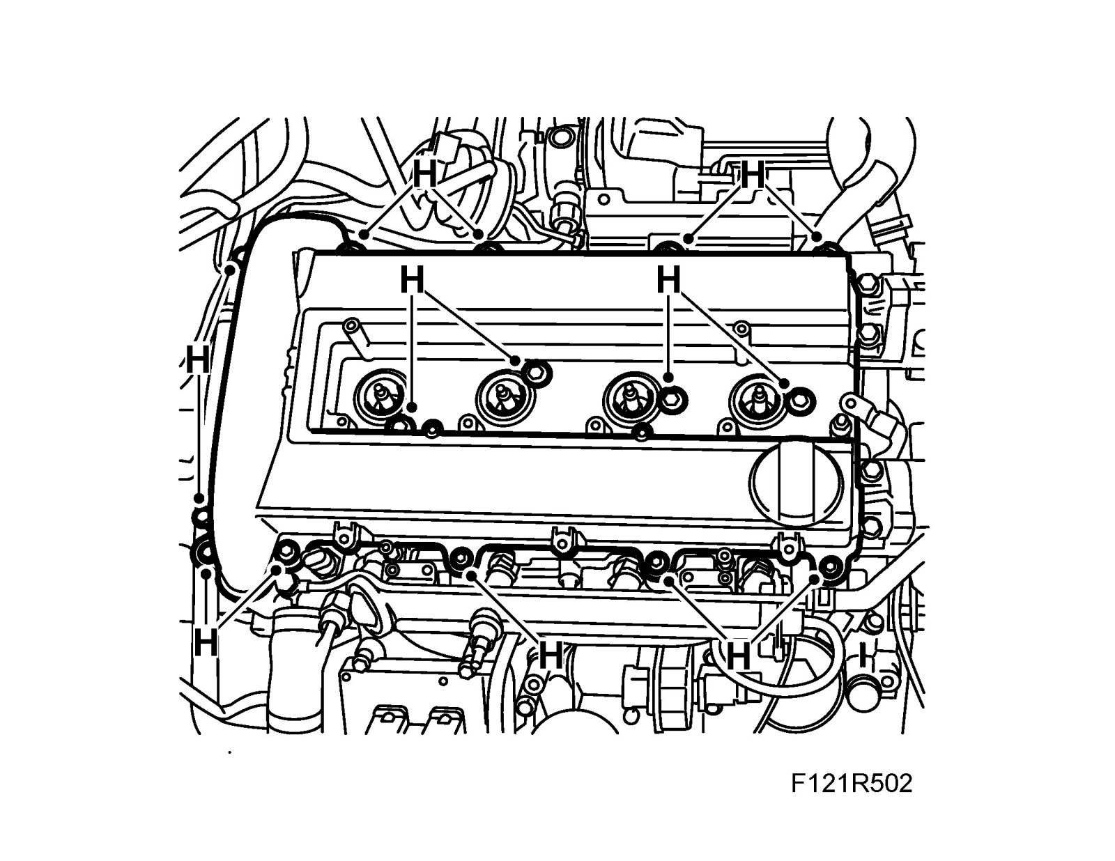 35. Connect the crankcase ventilation hose (D) to the camshaft cover.