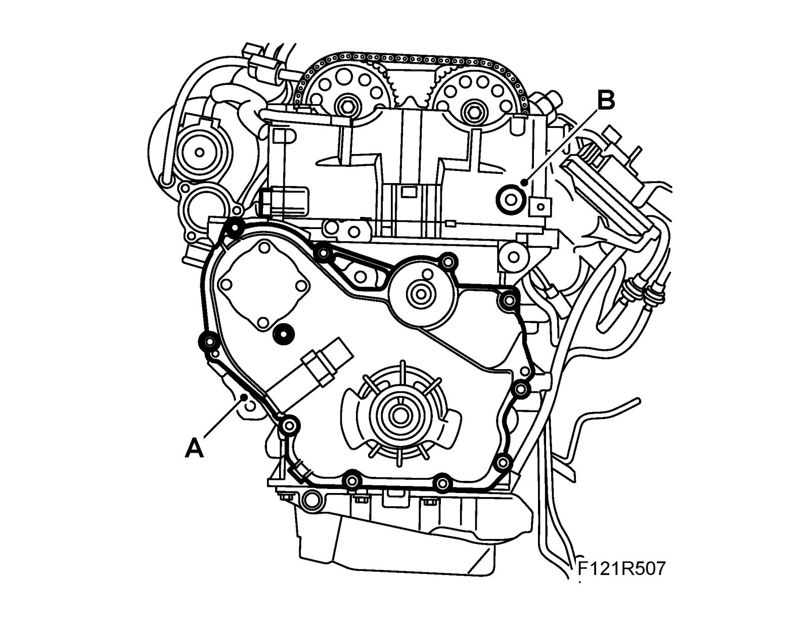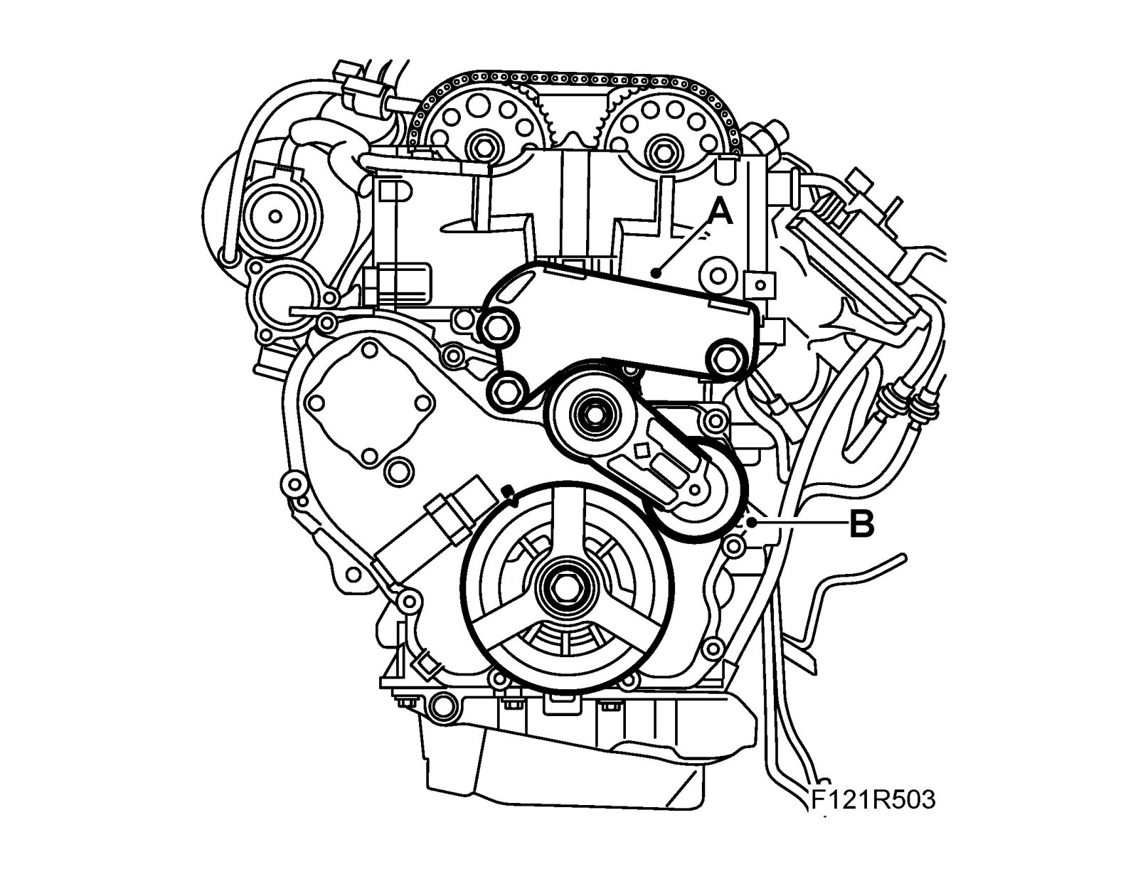 12. Lower the car and zero the engine by turning the crankshaft in the direction of rotation of the engine until the marking on the crankshaft pulley is aligned with the marking on the timing cover (A). The cam lobes on cylinder 1 intake and exhaust camshafts should be pointing up/in (B).