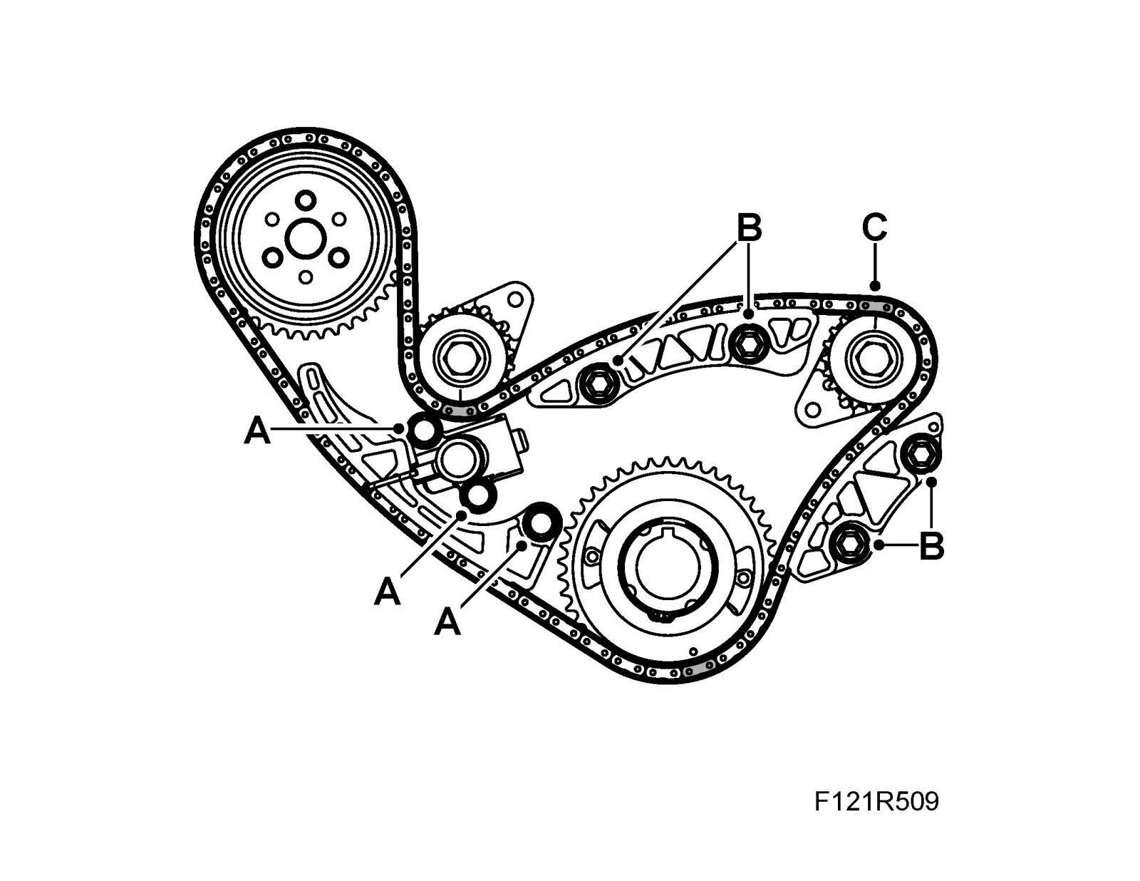 11. Fit the chain on the crankshaft sprocket and fit the chain guide. Fit the lower bolt (C).