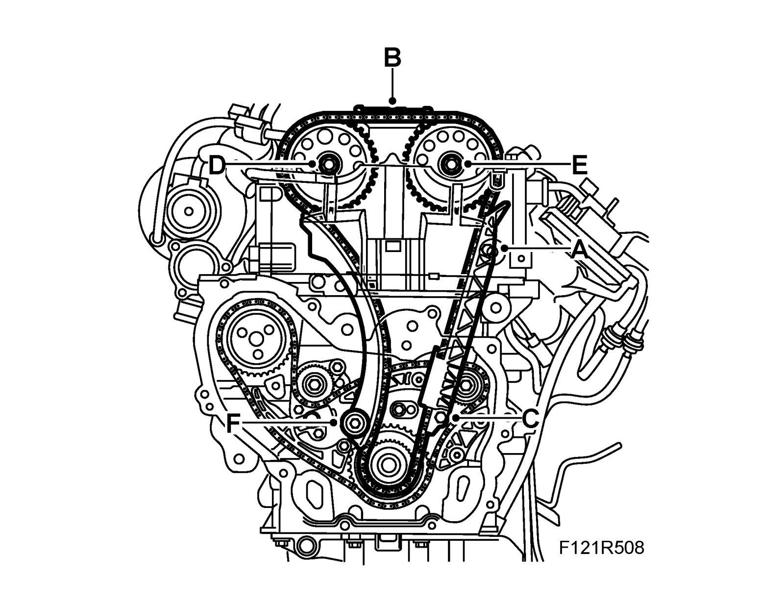 23. Remove the tensioner guide (F) by lifting it up. Inspect the condition of the guide. Replace if necessary.