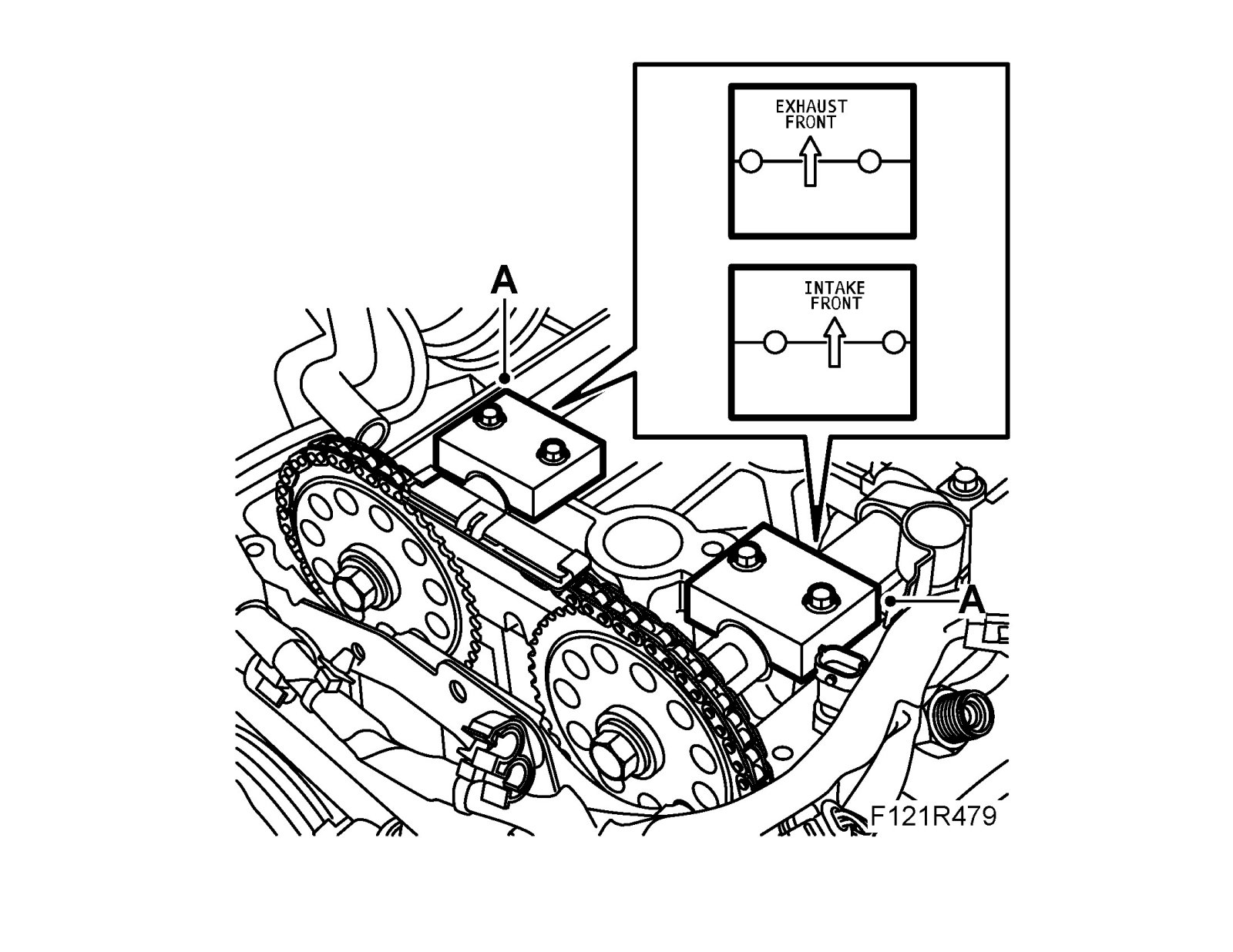 18. Release/activate the chain tensioner by carefully pressing on the timing chain or chain guide (as shown in the illustration). Use a screwdriver (A). Check that the tensioner has released.