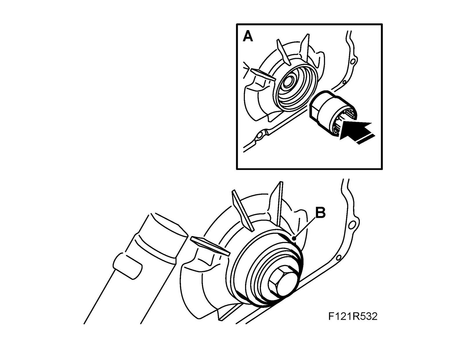 23. Position the fitting tool on the crankshaft. Tighten the sealing ring using the crankshaft pulley bolt until it is flush with the timing cover (B). Remove the tool.
