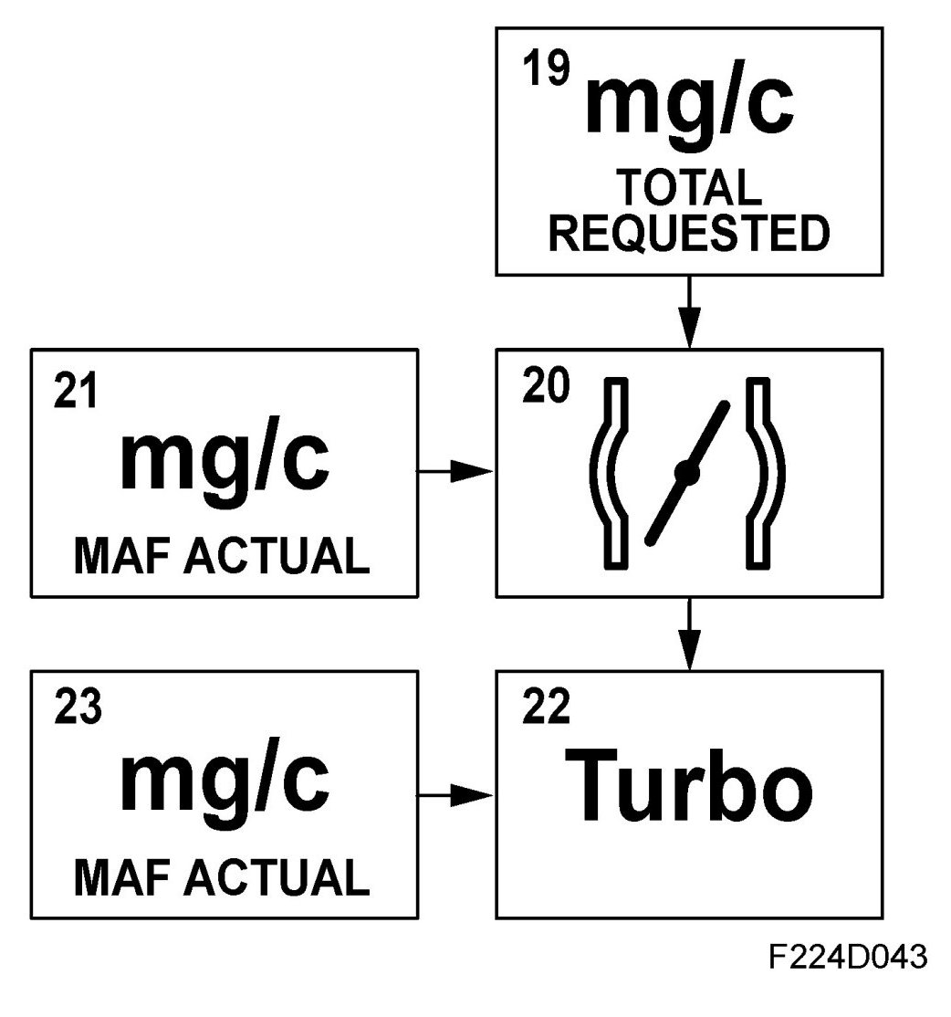 Requested air mass per combustion is converted to a voltage for throttle potentiometer 1. Charge air pressure and temperature are used to correct the conversion. The throttle motor turns the throttle until the value for throttle potentiometer 1 agrees with the requested value.