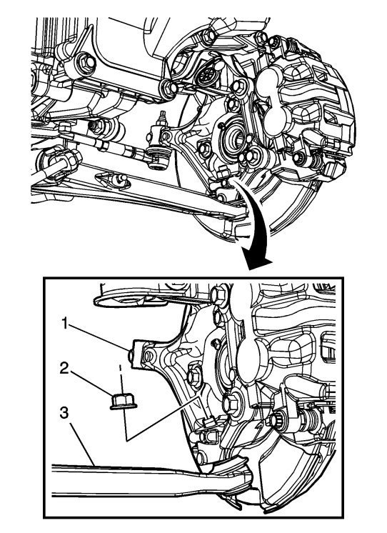 8. Install the ball joint fastener (2) to the ball joint and tighten to 30 Nm (22 lb ft) plus an additional 130 degrees.