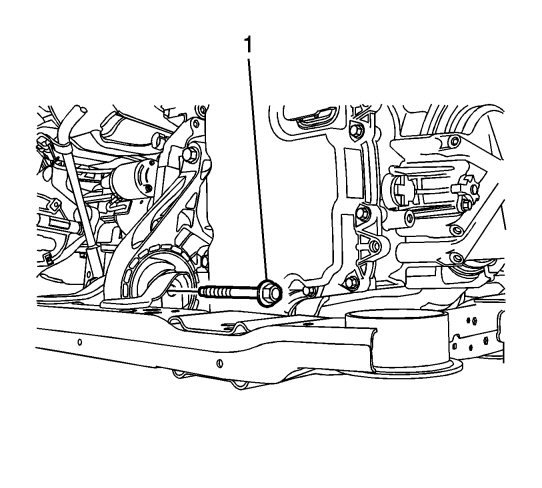 11. Remove the front transmission mount through bolt (1).