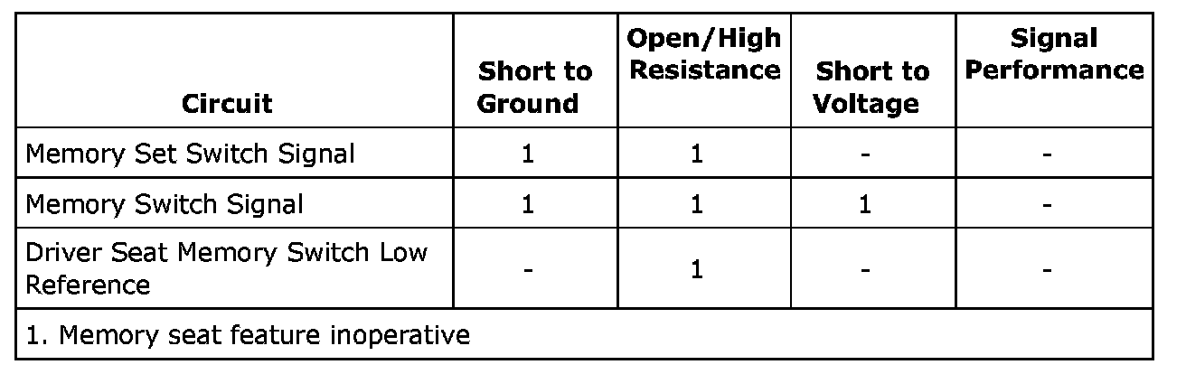 Low reference is supplied to the driver seat memory switch from the seat memory control module. When a memory switch is pressed, the signal circuit from the seat memory control module is pulled low through the switch contacts and series of resistors indicating the memory recall request. In response to this signal, the seat memory control module commands the appropriate seat motors to move to the pre-recorded seat positions stored in memory.