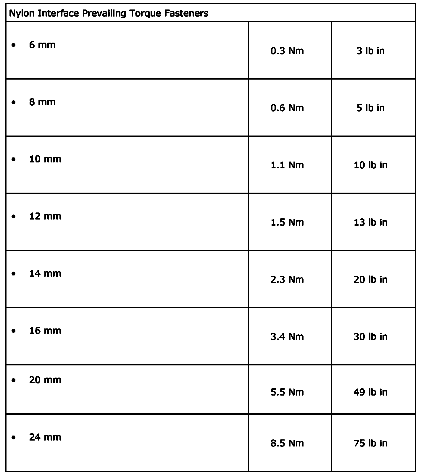 Metric Prevailing Torque Fastener Minimum Torque Development
