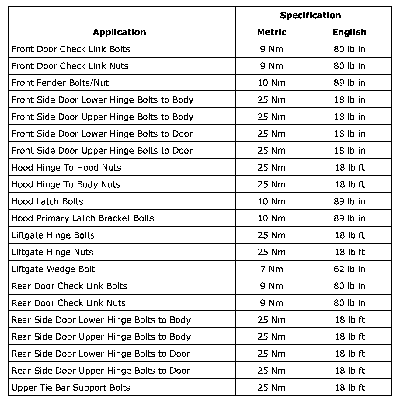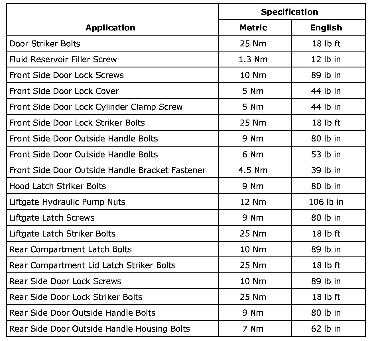 Fastener Tightening Specifications