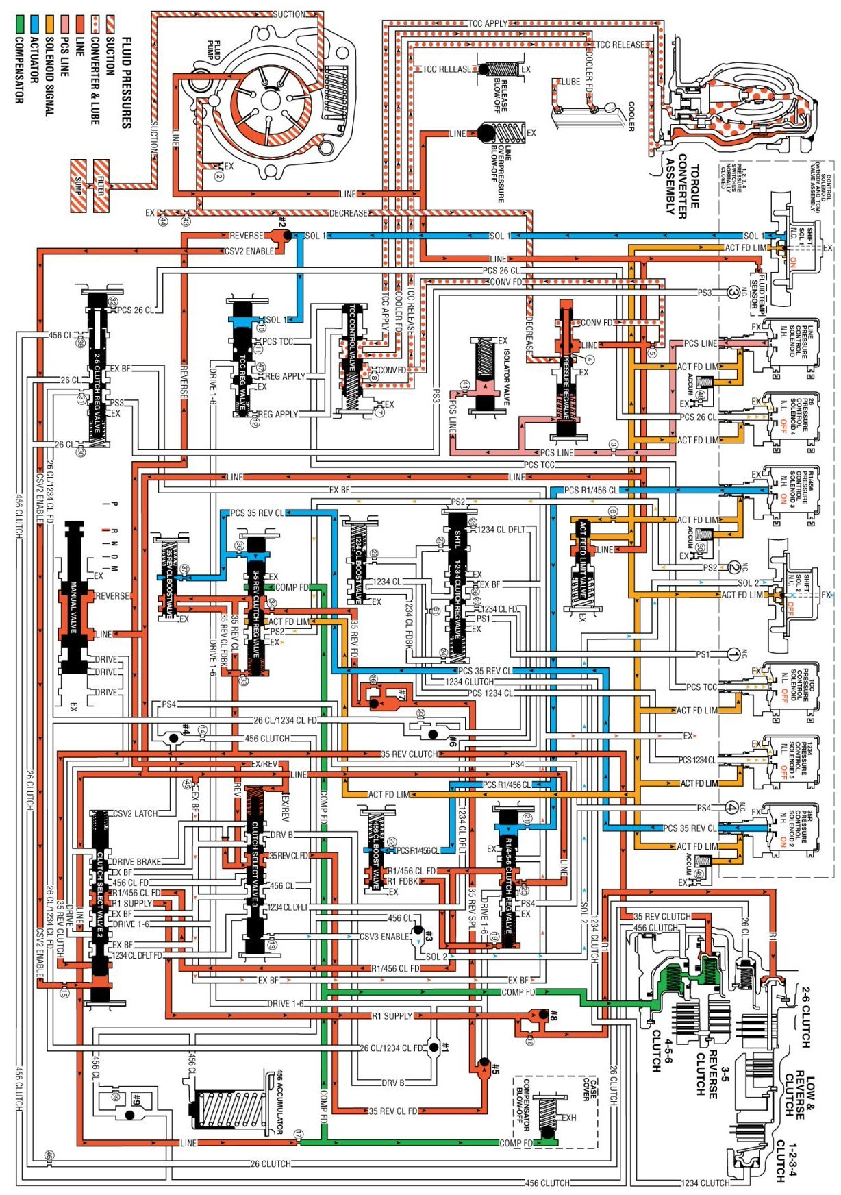 ReverseWhen the gear selector lever is moved to the Reverse (R) position (from the Park position) the normally high 35R pressure control solenoid 2 is commanded ON and the following changes occur in the transmission"s hydraulic and electrical systems: