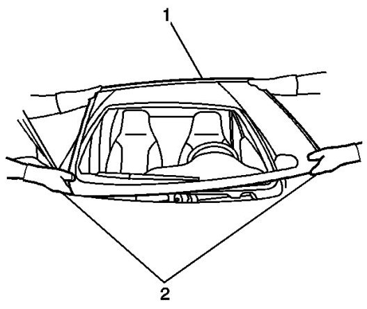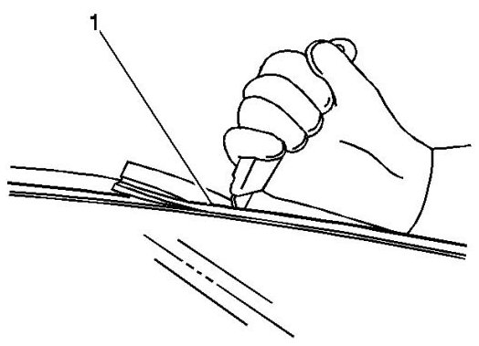 Using a utility knife, carefully cut the lace (1) from the sides and the top edge of the window to access the urethane adhesive bead, if equipped.