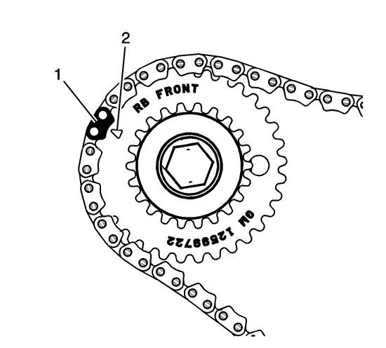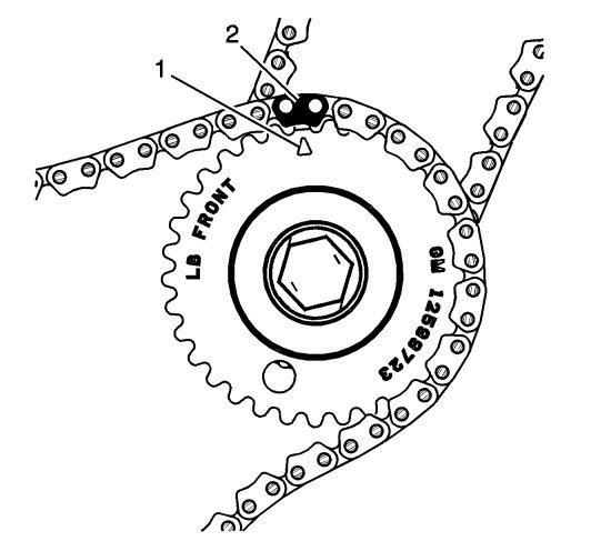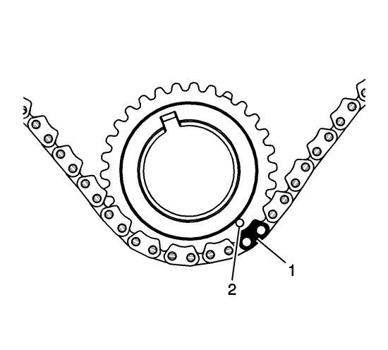 5. The crankshaft sprocket timing mark (2) will align with a timing camshaft drive chain link (1).
