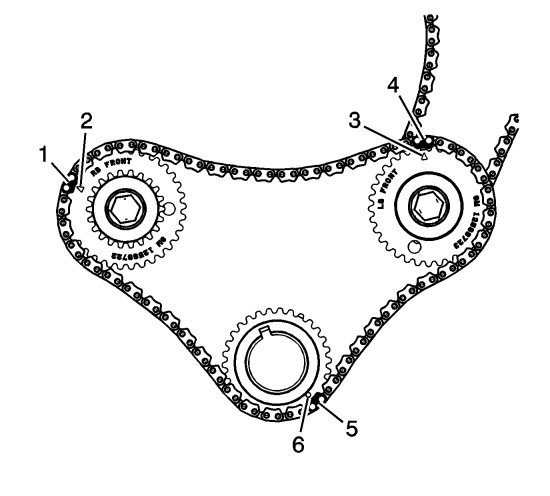 6. Ensure all the timing marks (2, 3, 6) are properly aligned with the timing camshaft drive chain links (1, 4, 5).