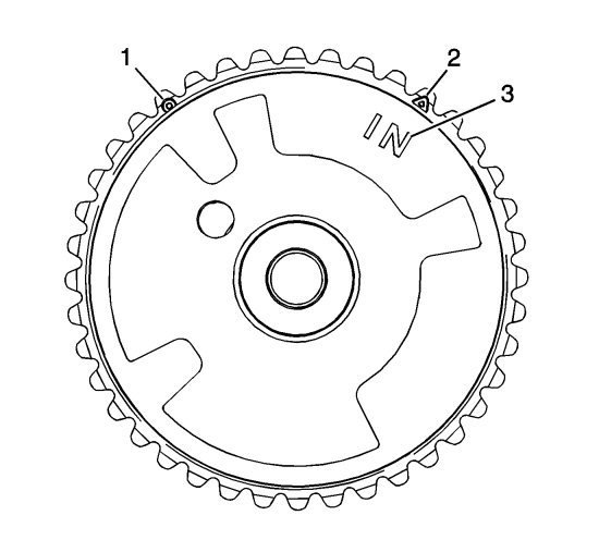 Camshaft Position Actuator Installation - Left Side Intake1. Ensure the proper camshaft position actuator is installed. Observe the body of the camshaft position actuator for the "IN" marking (3). The marking is for an intake camshaft position actuator.