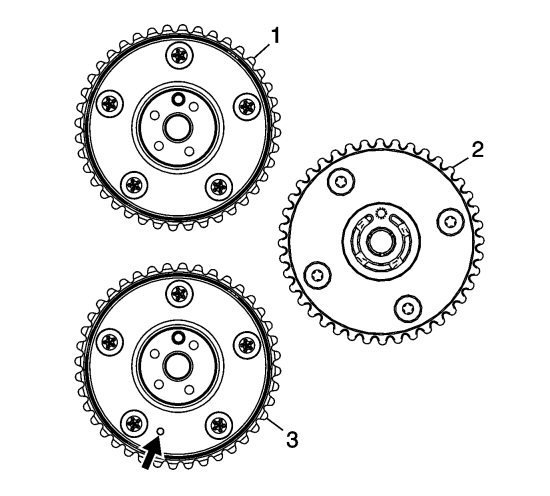 Ensure the proper camshaft thrust washer is used, if applicable. Use a 1.6 mm (0.063 in) thrust washer on applications that have 5 attaching screws on the back side of the camshaft position actuator without an identification dot (1). Use a 1.1 mm (0.043 in) thick thrust washer with yellow speckles on applications that have 4 attaching screws on the back side of the camshaft position actuator (2) and on applications that have 5 attaching screws on the back side of the camshaft position actuator with an identification dot (3).