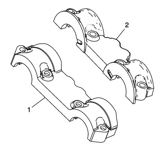 7. There are first design (1) and second design (2) camshaft front bearing caps. Applications that have a second design camshaft bearing cap (2) do not use thrust washers.