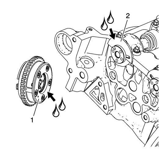 8. For applications without a camshaft thrust washer, apply a liberal amount of lubricant to the back of the camshaft position actuator (1) and front of the camshaft bearing cap (2). Refer to Adhesives, Fluids, Lubricants, and Sealers for recommended lubricant.