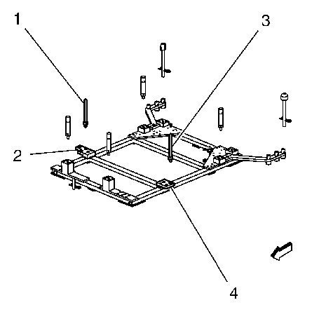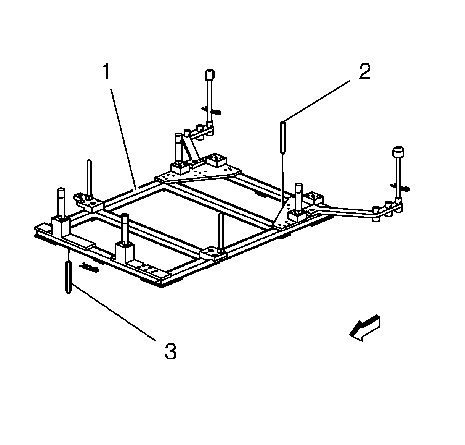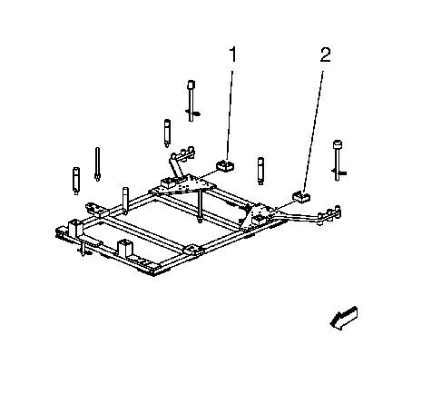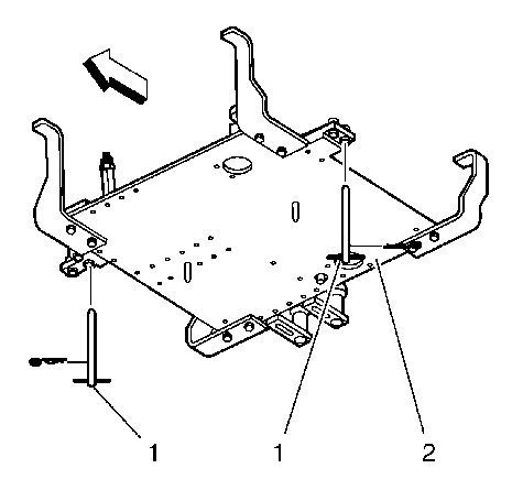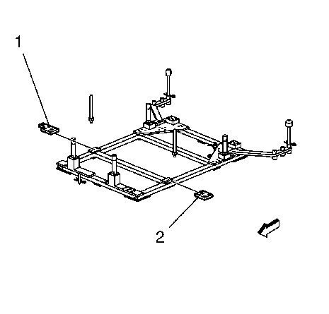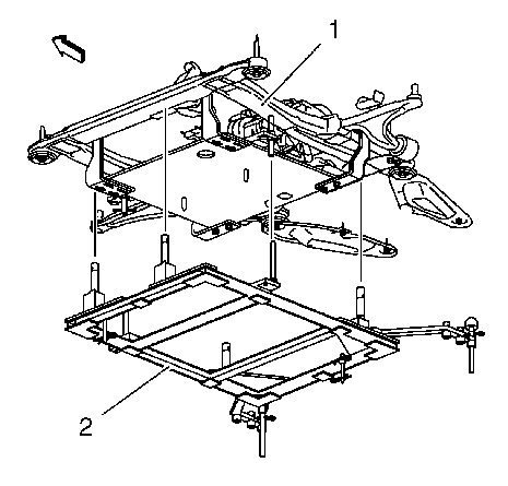 Raise the hydraulic lift with CH-49289 centering adapter (2) to support the front suspension frame (1).