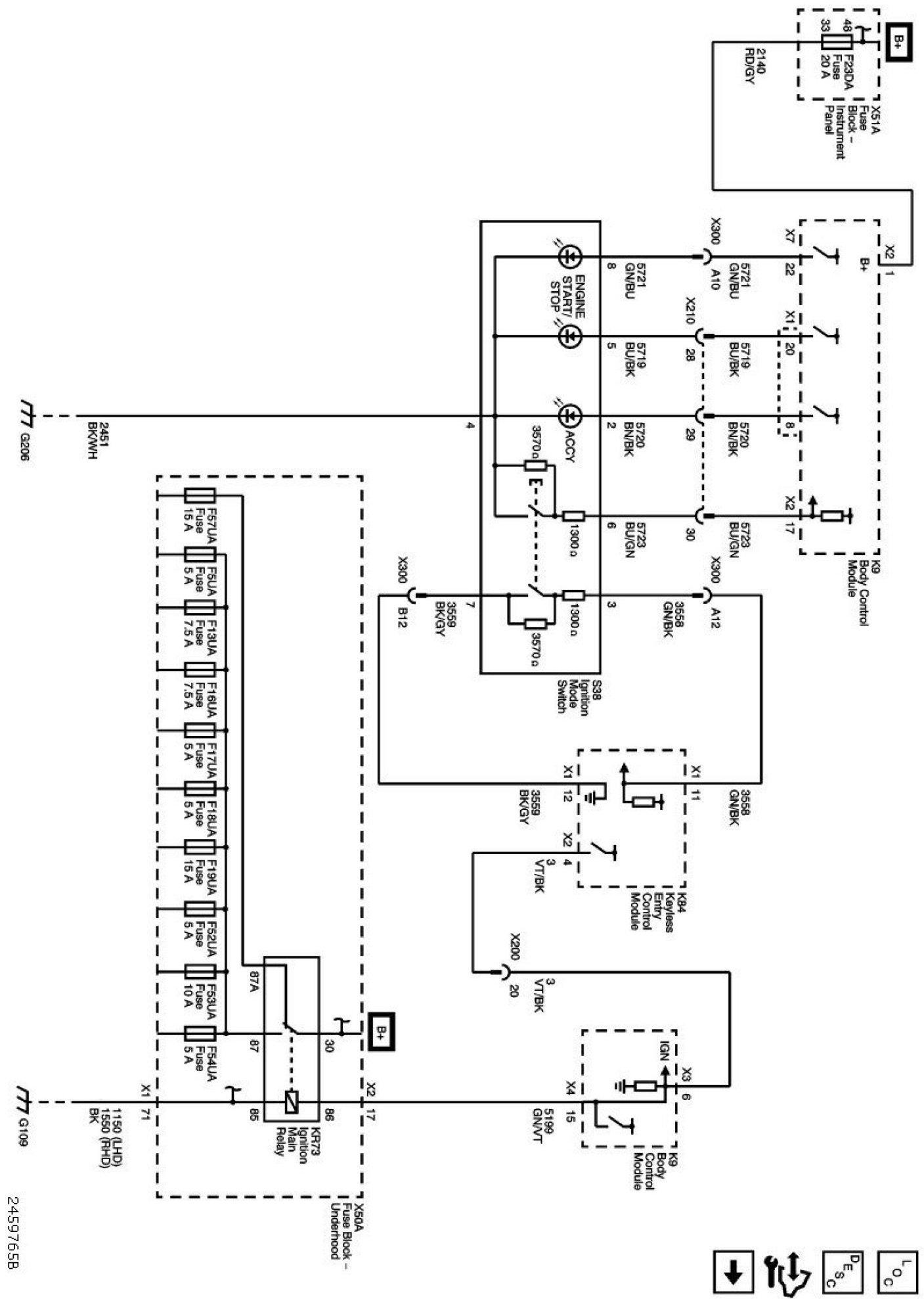The diagrams for the power supplies that may be feeding this system (+30, +15, +54, +X, and +B) ) can be found at Power and Ground Distribution diagrams.